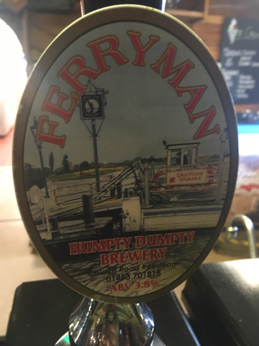 Arrived at the Reedham Ferry Inn ( where we had reserved a mooring) in time for a glass of something before supper. A pint of Ferryman (re-badged for the venue, but really Little Sharpie), from the Humpty Dumpty Brewery – right next door to the church established by St. Felix in 7th C – and the reason we are moored at Reedham.