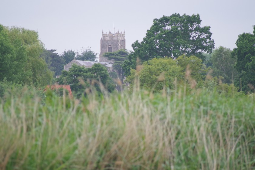 The first view of the tower as we wound our way up the narrow River Chet was over reeds and across marshes.
