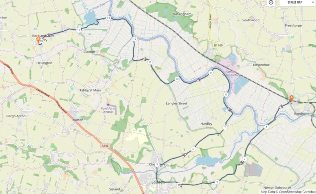 Crossing the chain ferry at Reedham, they will climb away from the marshes to a dizzying height of 52 feet; before passing through the market town of Loddon, where St. Felix founded a church in the, then, royal vill of the East Anglian Kingdom. The will take a break at Chedgrave before travelling on to Rockland and encounter their first broad.