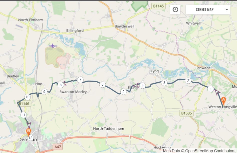 Today’s leg takes pilgrims from Weston Longville to Swanton Morley where it parts company with the Walsingham Way and travels south to Dereham where St. Withburga founded a monastery in the 8th Century.