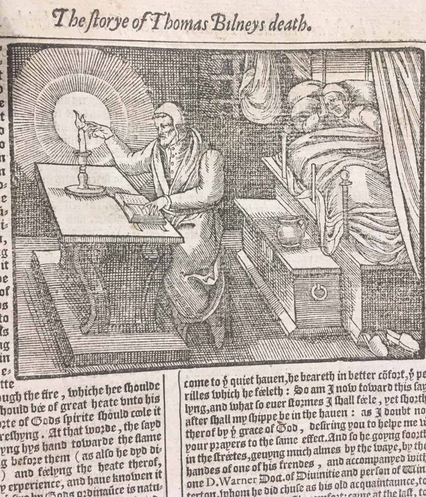 This woodcut depicts Thomas Bilney, sticking his finger in the candle flame on the night before he was burned at the stake , at Lollard’s Pit on 19th August 1531.