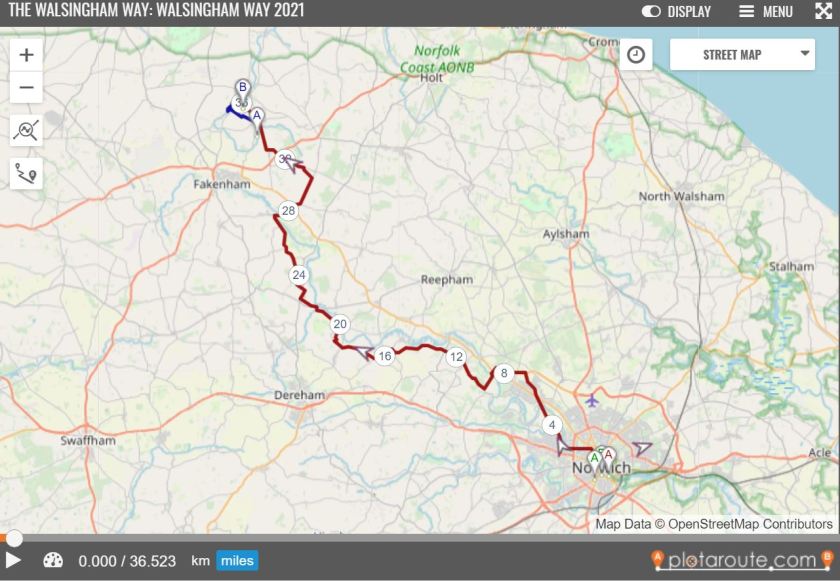 37 miles of waymarked path from Norwich and the Broads National Park to Walsingham and the Norfolk Coast Area of Outstanding Natural Beauty, through the heart of Norfolk. It counts as 59 Kilometres as the Camino Ingles.