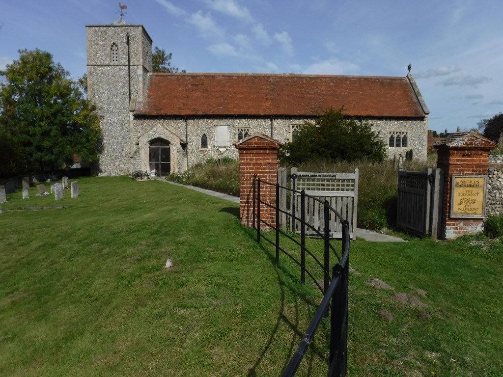 Leaving Great Snoring on the Barsham Road, we part company with those going directly to the centre of Walsingham at the top of the Greenway. Continuing in the same direction, in two minutes fork right and head downhill towards Haughton, St. Giles. Arriving at the crossroads on the Fakenham Road, St.. Giles church can be seen to the left. We cross the road and continue down hill to a ford, where we cross the River Stffkey dry shod by way of a footbridge . On the other side, a left turn at the “T” junction brings us, in a quarter of a mile, to the Slipper Chapel and the National Catholic Shrine of Our Lady of Walsingham.