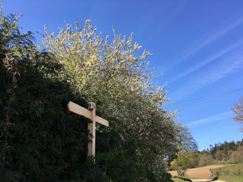 The main route passes through a gate by the house at the marsh edge, then straight up and over the brow of Royal Hill , from where the pilgrim gains an overview of church and village, before arriving at a way marker on Ringland Lane close to St. Peter’s Church with angel roof and medieval glass