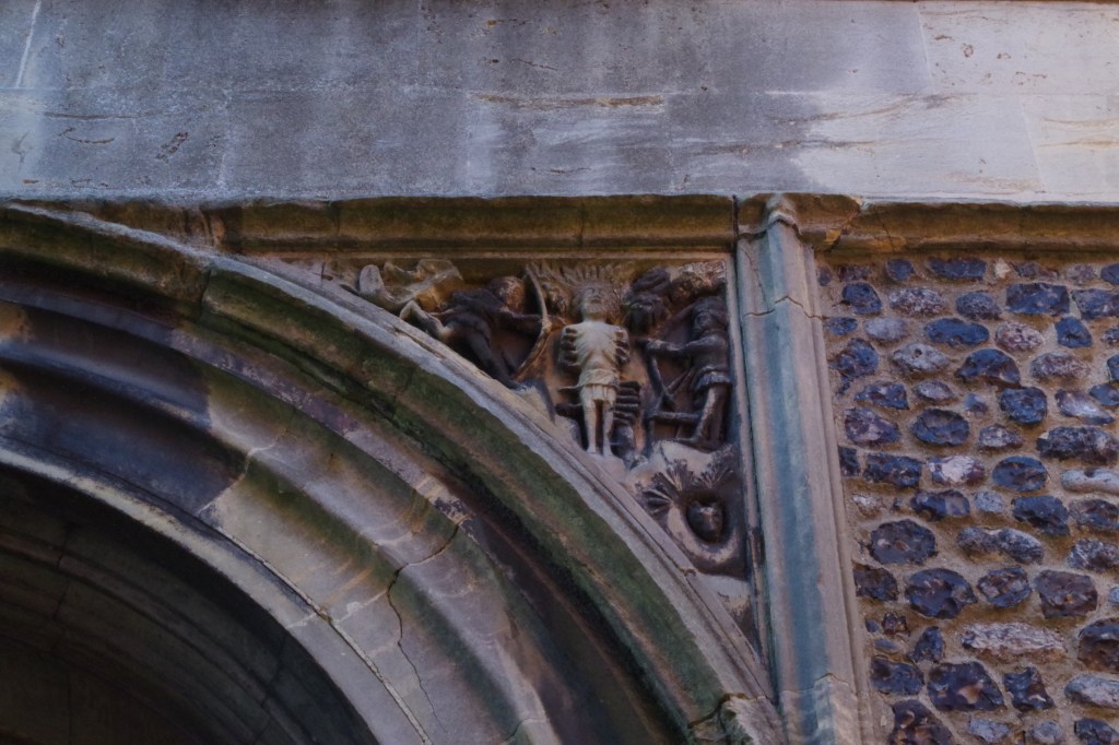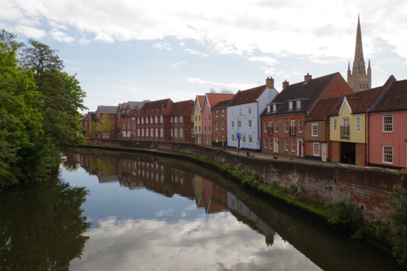 i) From Herbert de Losinga’s 1096 romanesque Cathedral Church of the Holy and Undivided Trinity the route brings pilgrims through the Erpingham Gate (named after the hero of the Battle of Agincourt) opposite the Church of St.George, Tombland, turning north they cross the River Wensum, for the first time at Fye Bridge, once the site of a ducking stool, passing the church of St. Simon and St. Jude on the way.