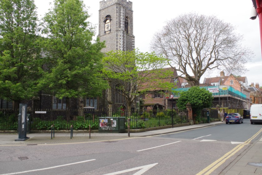 Continuing on Colegate, pilgrims cross Duke Street to arrive at the Church of St. Michael (St. Miles) , Coslany where the two routes meet.