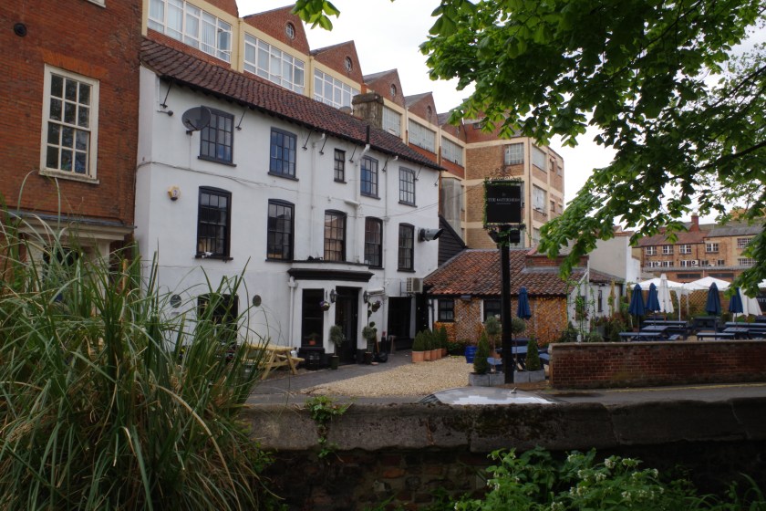 Continuing north, a left turn at the Church of St. Clement brings them to Colegate. Passing the Congregational Old Meeting House and the Unitarian Octagon Chapel , they come to St.George, Colegate. Opposite St.George’s on the corner of Muspole Street and Colegate is the Gatherers vegan bar and restaurant. Once known as the Woolpack, beams in the downstairs bar may have come from the Prior of Walsingham’s house that once stood on the site.