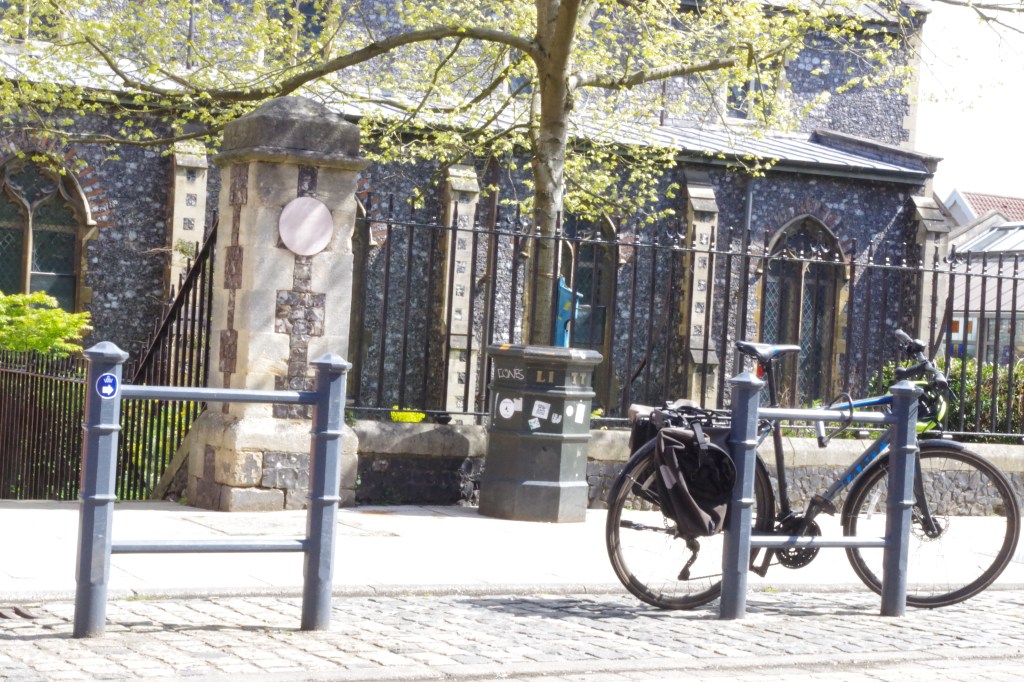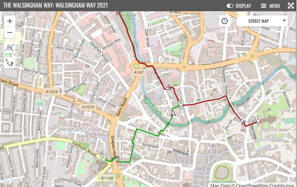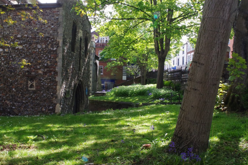 ii) From St. John’s Cathedral, pilgrims take the footbridge to cross the Inner Ring Road, turning left in Upper St. Giles to head north on Cow Hill beside St.Giles Churchyard. Then, continuing downhill on Ten Bells Lane, they turn right into St. Benedict’s St. opposite St. Swithun’s Church, now Norwich Arts Centre; heading east on St. Benedict’s St. they pass St.Margaret’s Church, sometimes open for art exhibitions; and turn left down St. Lawrence Little Steps, to cross Westwick St. and continuing north on Coslany St. to cross the river. At the Church of St. Michael (St.Miles), Coslany they turn right in front of the church. At the south-east corner of the churchyard the two routes meet.