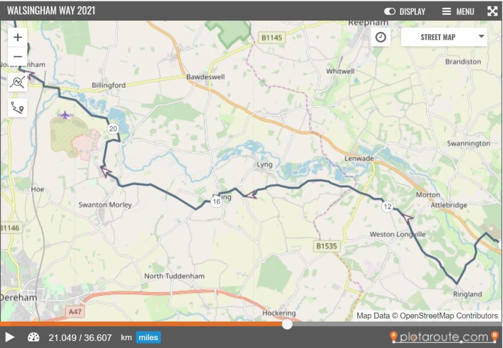 There are waymarked detours from the main route to the villages of Weston Longville and Lyng.